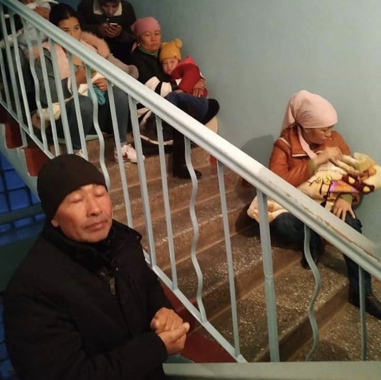 Чогулган эл ушинтип күндүн суугунда тоң болгон бетон тепкичтин үстүнө отуруп алып, кезегин күтөт экен. Деги быйыл "санариптештирүү жана аймактарды өнүктүрүү" жылыбы өзү? Жыты дагы жок го...