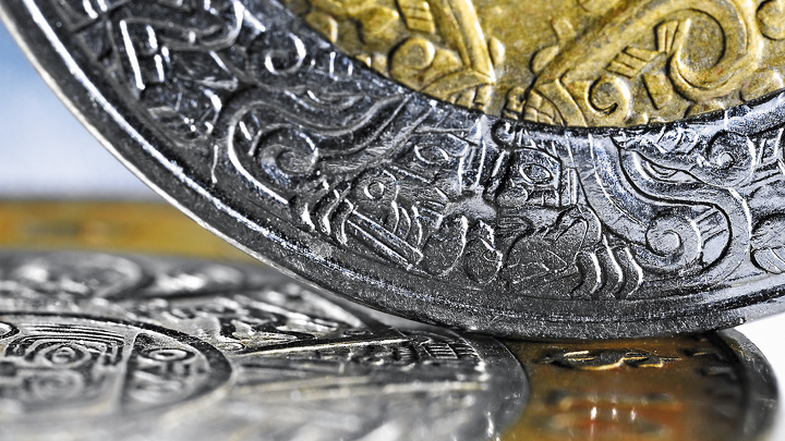Монета 925/1000 (46,2 грамм) күмүштөн жасалган, 999/1000 майда алтындан (16 грамм) жасалган.