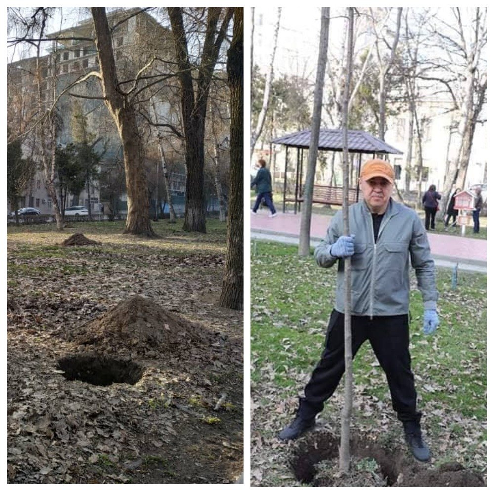 “Көчөт олтургузуу үчүн чуңкурлар алдын-ала казылган жок. Болгону мэриянын кызматы атайын казыктарды кагып кетишкен. Ошол жерлерди казып, көчөттөрдү отургузуп жатабыз”, - деп билдирген Шаболотов.