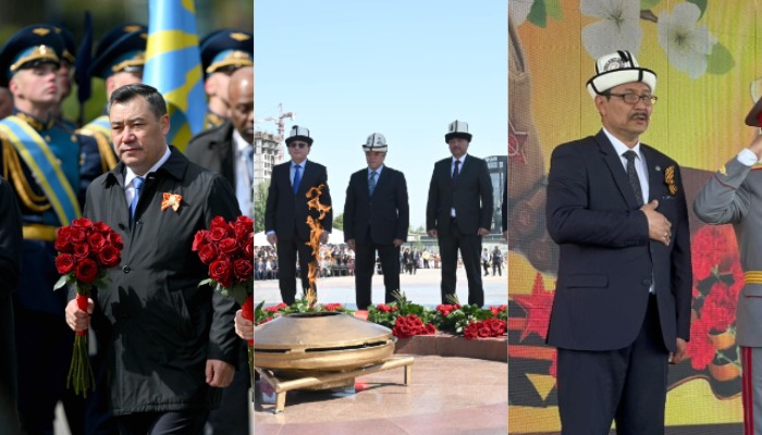 Быйыл Жеңиш күнүнө арналган Бишкектеги иш чарада Жогорку Кеңештин төрагасы Нурланбек Шакиев, Жогорку Соттун төрагасы Замирбек Базарбаев жана мамлекеттик катчы Сүйүнбек Касмамбетов эч кандай майрамдык атрибут тагынышкан жок.