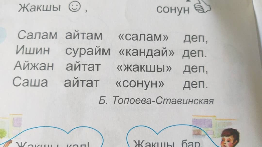 Ал, "Орус мектептеринин биринчи классына арналган "Кыргыз тили" китебин ача коюп, кыргыздын "Амандашуу", "Арыба", "Бар бол" деген нукура төл сөздөрү унутта калып, семит элдеринен ооп келген "шелом", "салам" уңгуларынан куралган сөздөр аркылуу орус тилинде билим алган балакайларды келегей кыргыз тилине "оозантып" жаткан авторлорду көрүп, чынын айтсам, оозум ачылып калды.