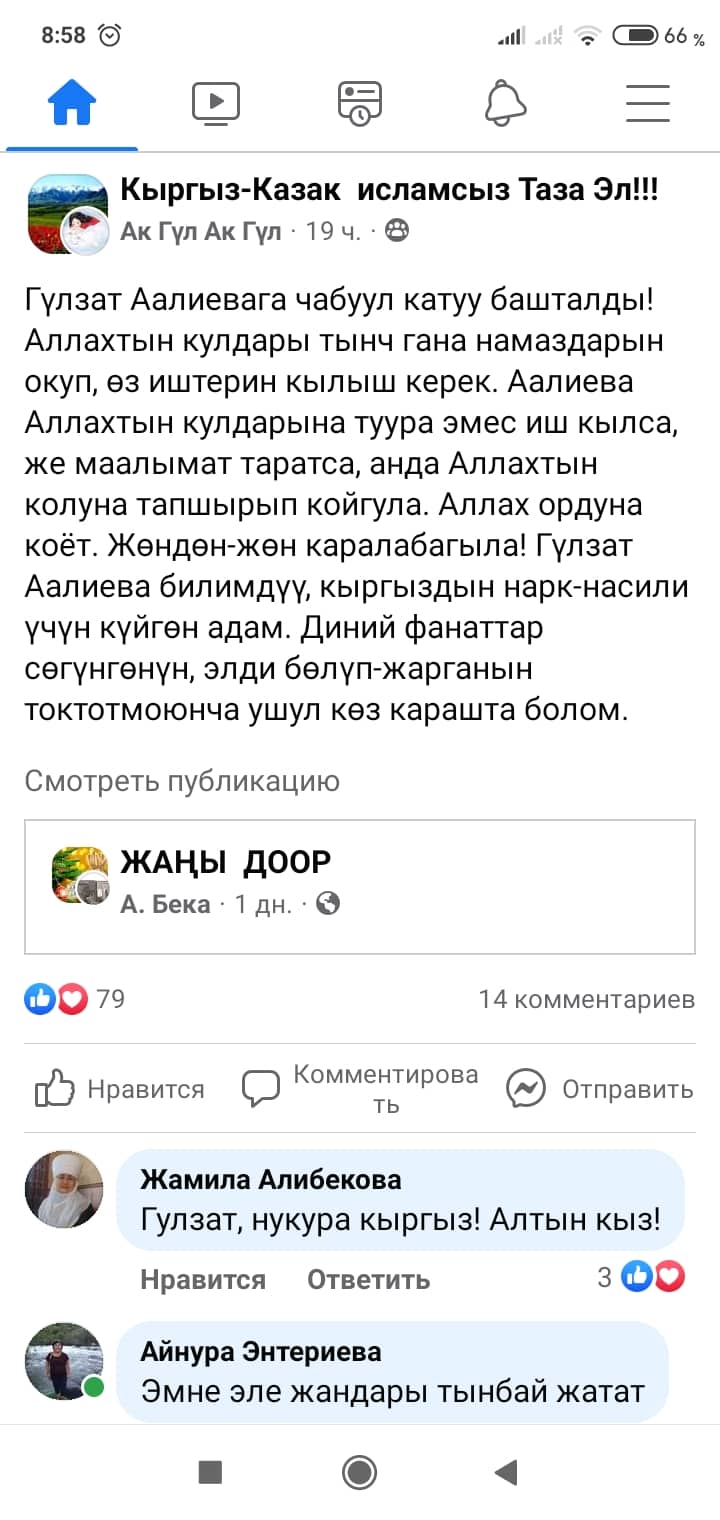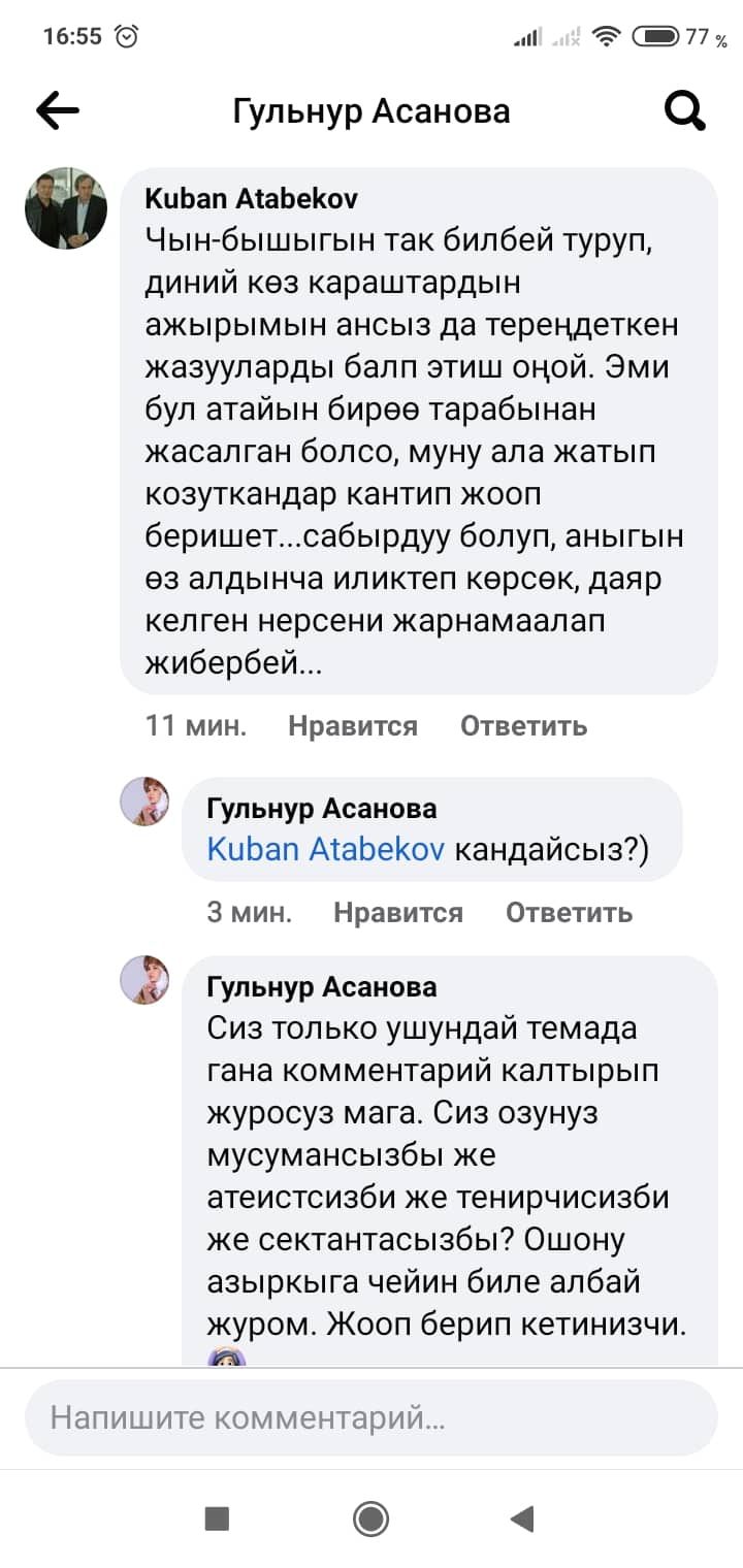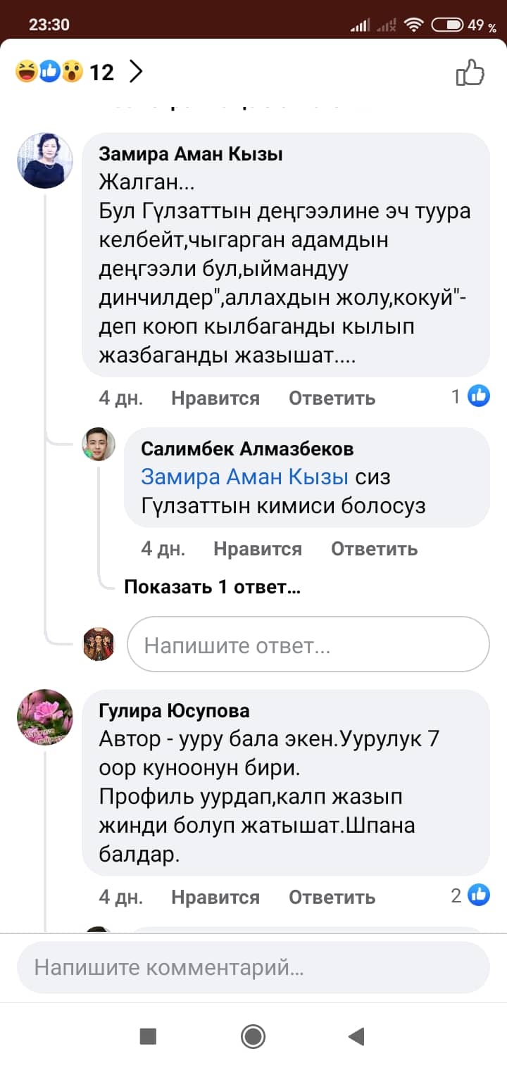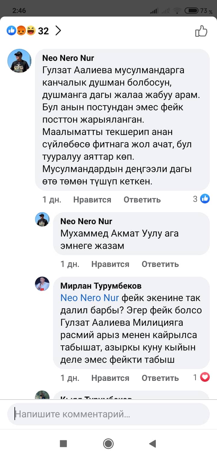Белгилей кетсек, скриншоттордон көрүнүп тургандай, Манас таануучу Гүлзат Аалиеваны каралоо максатында Гүлнур Асанова чындыкка дал келбеген фейк маалыматты соцтармакка уу-дуу кыла таратканын коомчулук салттуу ислам дининин этикасы менен кыргыздын сакралдуу (ыйык, касиеттүү) дүйнөсүнө болгон тарыхый жана кылмыштуу кол салуу катары баалап, өтө кыжырдануу менен кабыл алууда.