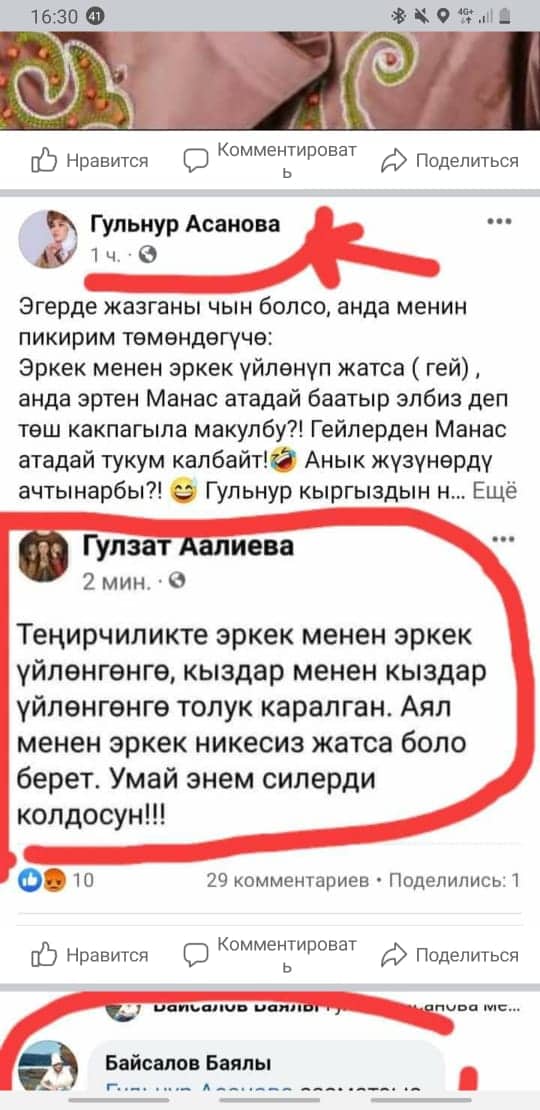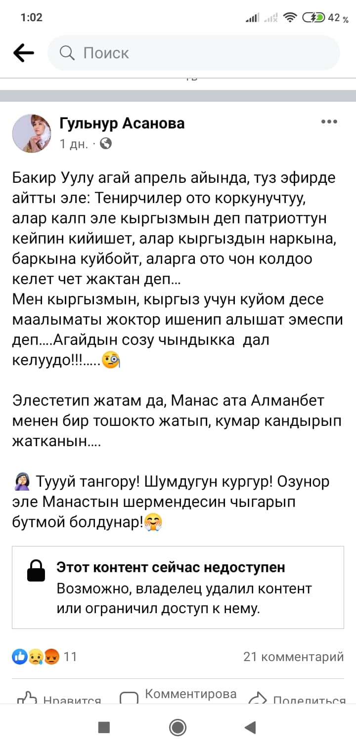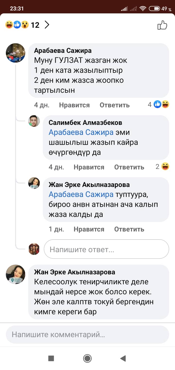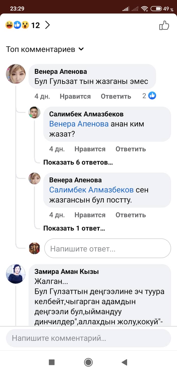 Белгилей кетсек, скриншоттордон көрүнүп тургандай, Манас таануучу Гүлзат Аалиеваны каралоо максатында Гүлнур Асанова чындыкка дал келбеген фейк маалыматты соцтармакка уу-дуу кыла таратканын коомчулук салттуу ислам дининин этикасы менен кыргыздын сакралдуу (ыйык, касиеттүү) дүйнөсүнө болгон тарыхый жана кылмыштуу кол салуу катары баалап, өтө кыжырдануу менен кабыл алууда.