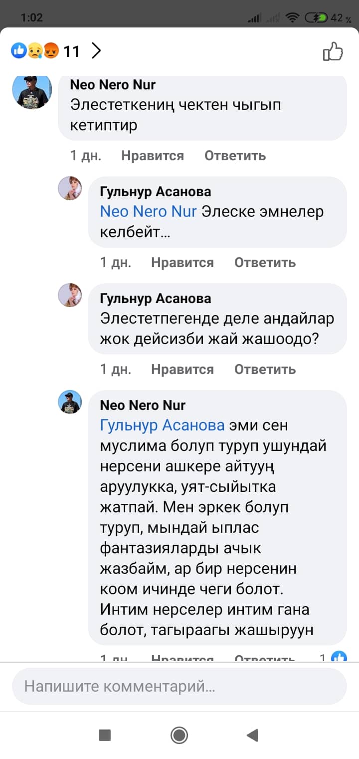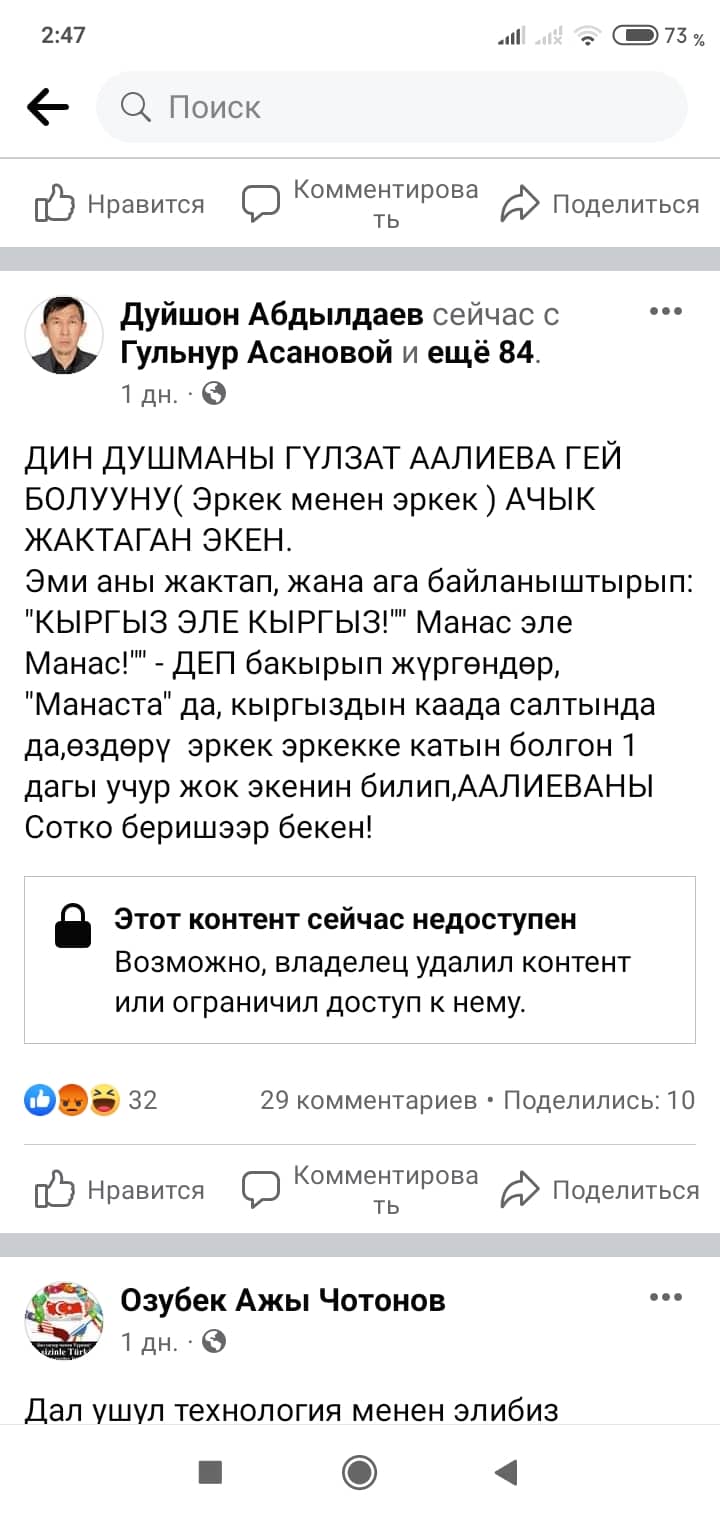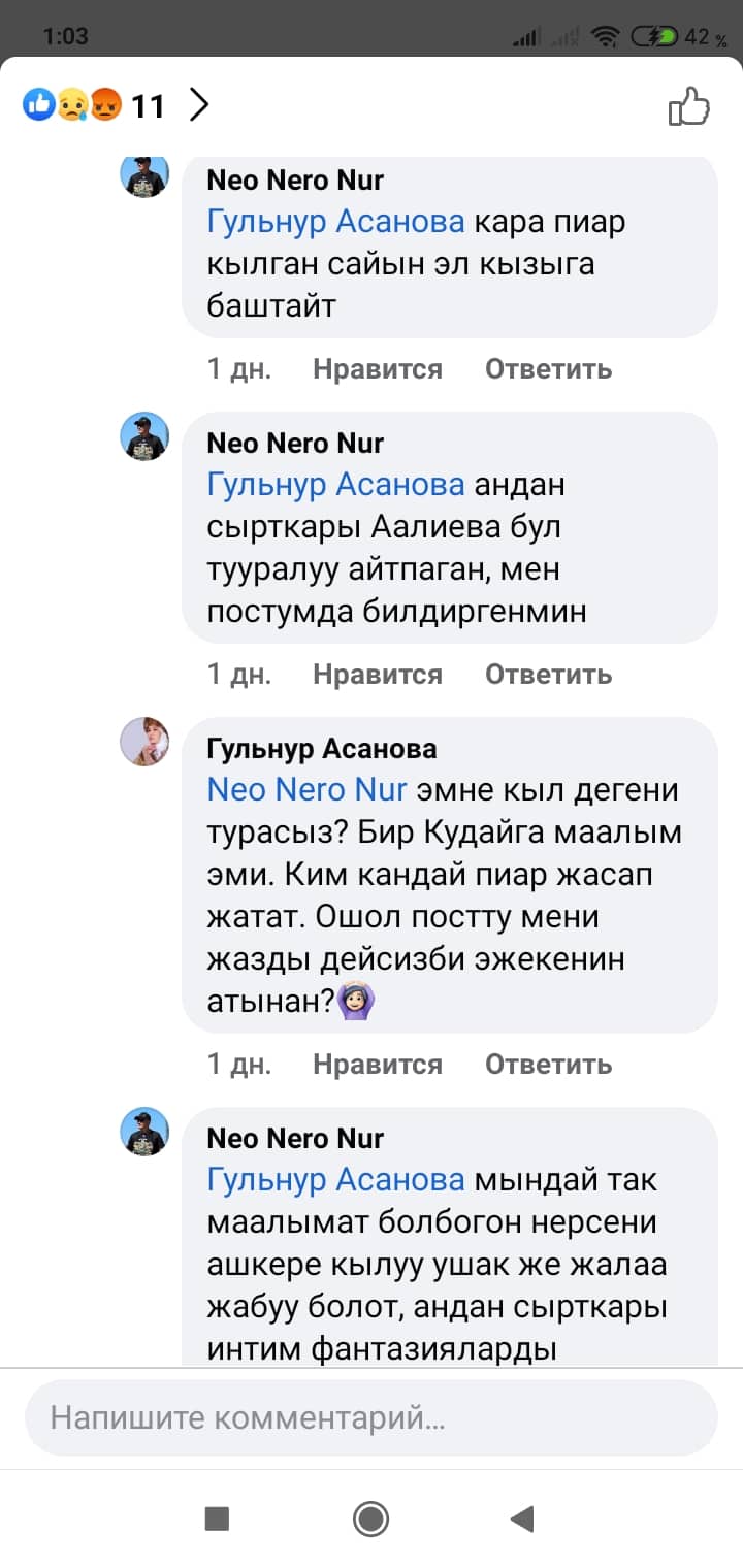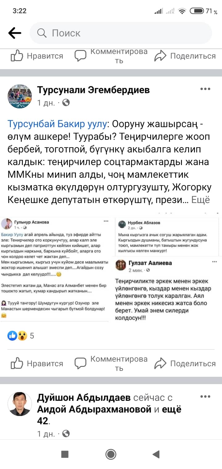 Белгилей кетсек, скриншоттордон көрүнүп тургандай, Манас таануучу Гүлзат Аалиеваны каралоо максатында Гүлнур Асанова чындыкка дал келбеген фейк маалыматты соцтармакка уу-дуу кыла таратканын коомчулук салттуу ислам дининин этикасы менен кыргыздын сакралдуу (ыйык, касиеттүү) дүйнөсүнө болгон тарыхый жана кылмыштуу кол салуу катары баалап, өтө кыжырдануу менен кабыл алууда.