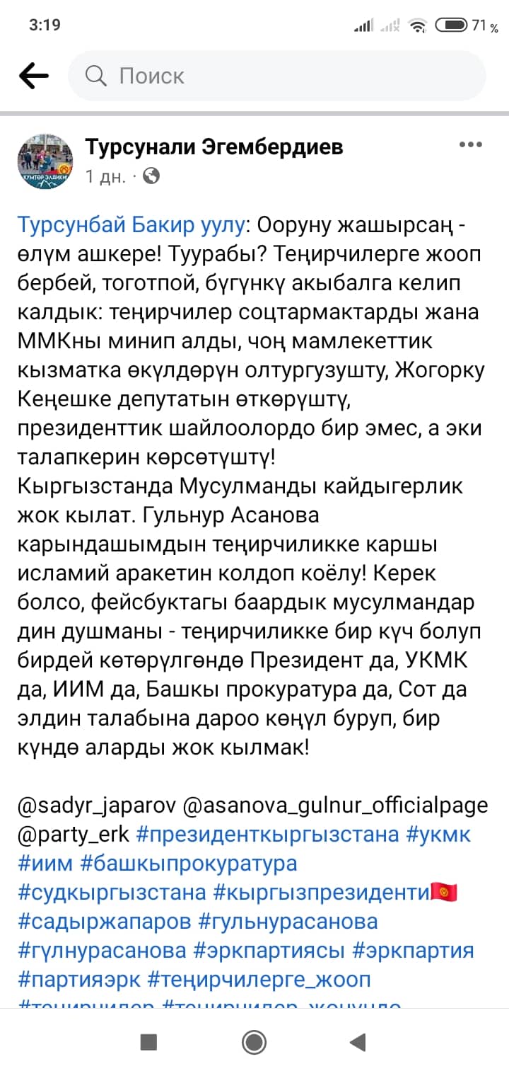 «Ашепке радикалдуу динчилердин бир ууч тобунда жүргөн адвокат Аида Абдрахманованын мындан 2-3 күн мурда Facebook'ка чыккан Манас таануучу Гүлзат Аалиева тууралуу постунда «Бизге факт керек» деген сураныч түрүндөгү «фас!» командасы менен Өзүбек Чотонов, Турсунбай Бакир уулу, Дүйшөн Абдылдаев баш, ырчы Гүлнур Асанова төш болуп мени жалган жалаа жапкан фейк маалыматты факт катары көтөрө чаап, мени катуу рекламалап калышты.
