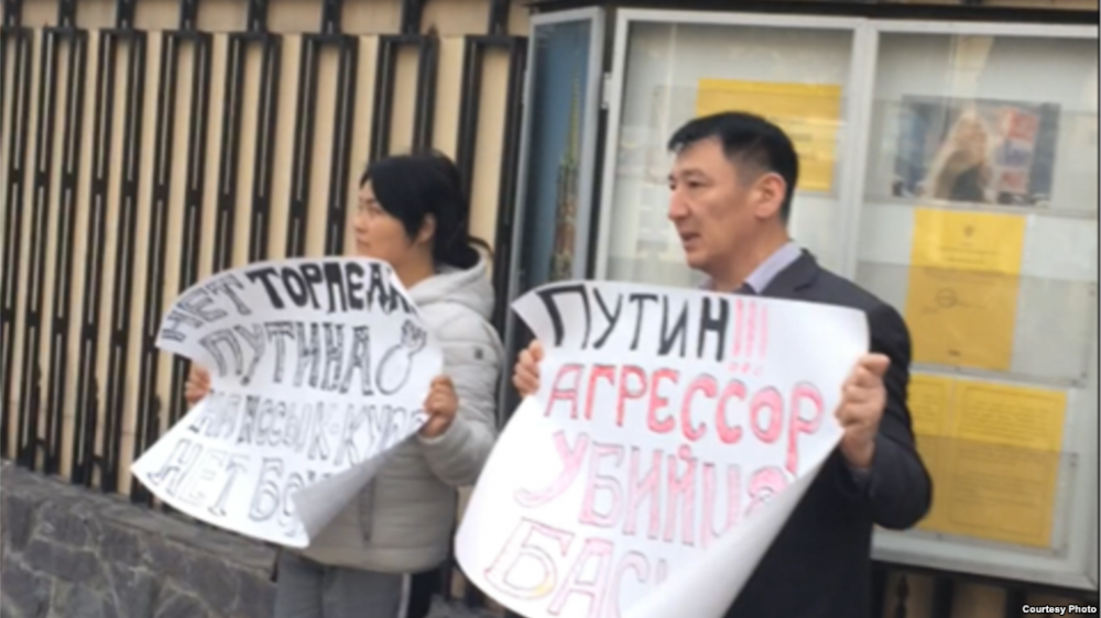Активисттер Владимир Путин Кыргызстанга келерден бир күн мурун 27-мартта Бишкектеги орус элчилигинин астына пикетке чыгышкан. Алар колдоруна «Путин - агрессор, канкор» жана «Ысык-Көлдө Путиндин торпедаларына жол жок» деген жазуусу бар плакаттарды кармап турганда милиция кармап кеткен. Кийин аларга «улут аралык кастыкты козутуу» айыбы тагылган.