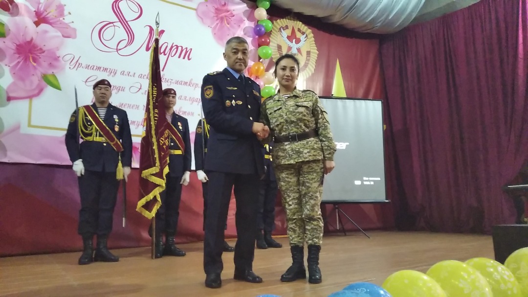 Аскер айымдарын келе жаткан майрамы менен Кыргыз Республикасынын ИИМдин Ички коопсуздук аскер кызматынын Колбашчысы, полковник Исламбек Кенжекулов куттуктады. Залдагы баардык катышуучуларга кайрылып, ал өлкөнүн коомдук жана маданий турмушунда, аскер бөлүктөрүнүн ишмердүүлүгүндө аялдын ролун өзгөчө белгилеп, салтанаттуу шартта погончон айымдарга түзүмдүк медалдарды, Ардак грамоталарды, баалуу белектерди жана акчалай сыйлыктарды тапшырды.