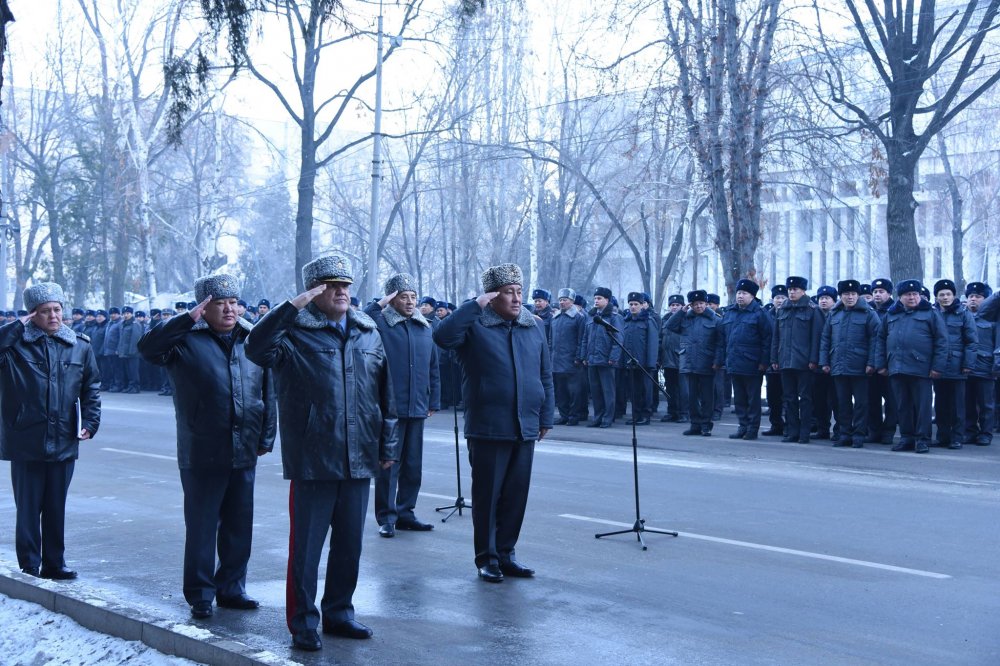 Андан соң, ИИМдин Борбордук аппаратынын кызматкерлери салтанаттуу жүрүштөн өтүшүп, саптык даярдыгын көрсөтүштү.