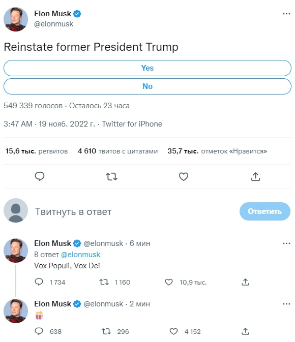 Америкалык ишкер Илон Маск Twitter колдонуучуларын АКШнын мурдагы президенти Дональд Трамптын аккаунтун калыбына келтирүүгө добуш берүүгө чакырды. Тиешелүү сурамжылоону ал 18-ноябрда өзүнүн аккаунтуна жарыялады.