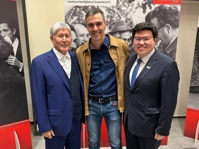 Сүрөттө Алмазбек Атамбаев, Испания өкмөтүнүн башчысы Педро Санчес жана Султанбековду көрүүгө болот.