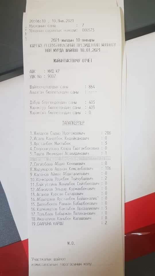 Маалыматка ылайык, биринчи орунда президенттикке талапкер Садыр Жапаров 286 добуш менен алдынкы саптан орун алган. Андан соң Адахан Мадумаров 106 добуш менен экинчиликте келе жатат. Ал эми 3 добуш топтогон Мыктыбек Арстанбек үчүнчү орунду ээлеген.
