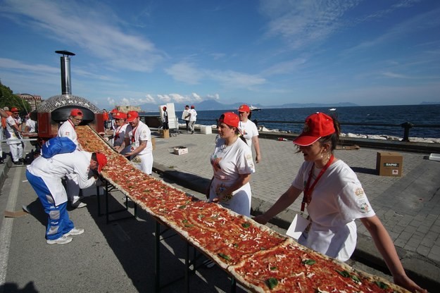 Италиянын Неапол шаарында 250 ашпозчу узундугу 1860 метр болгон пицца жасап, дүйнөлүк рекорд коюшту. 2 тонна ун, 2 тонна моцарелла жана 1.6 тонна помидор керектелген бул пиццаны ашпозчулар 11 саат аралыгында жасап бүтүшкөн.