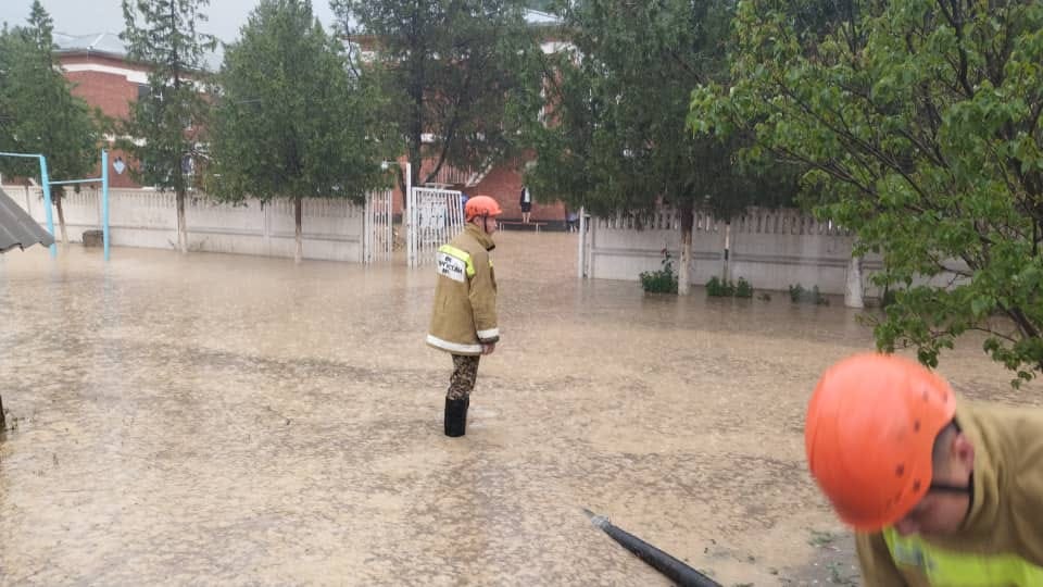 Жерине мотопомпа менен 6 куткаруучу тартылып, тазалоо иштери жүрүүдө.