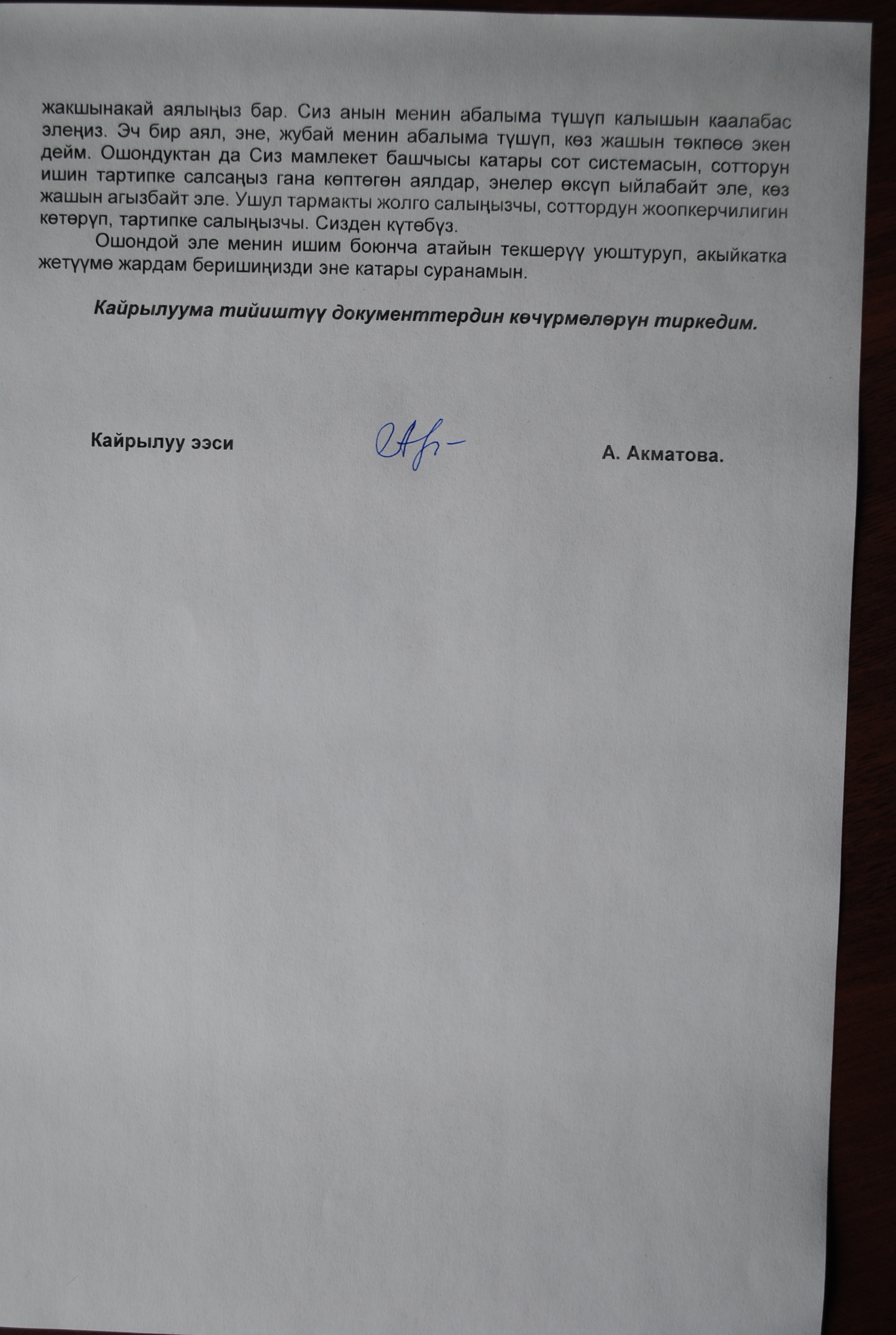 элеңиз. Эч бир аял, эне, жубай менин абалыма түшүп, көз жашын төкпөсө экен дейм. Ошондуктан да Сиз мамлекет башчысы катары сот системасын, сотторун ишин тартипке салсаңыз гана көптөгөн аялдар, энелер өксүп ыйлабайт эле, көз жашын агызбайт эле. Ушул тармакты жолго салыңызчы, соттордун жоопкерчилигин көтөрүп, тартипке салыңызчы. Сизден күтөбүз. Ошондой эле менин ишим боюнча атайын текшерүү уюштуруп, акыйкатка жетүүмө жардам беришиңизди эне катары суранамын. Кайрылуума тийиштүү документтердин көчүрмөлөрүн тиркедим.