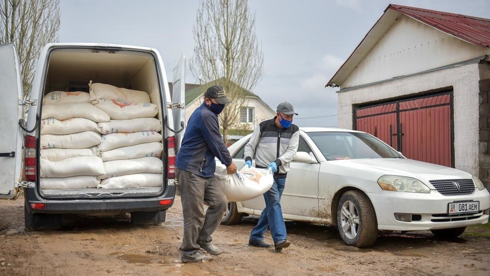 Турмуштук оор шартта калган жарандарды колдоо үчүн гүманитардык азык-түлүктүн топтомун таркатуу башталды. Бул иш даректүү түрдө, Кыргыз Республикасынын Эмгек жана социалдык өнүктүрүү министирлиги тарабынан берилген тизменин негизинде жүргүзүлүүдө. Мындан тышкары бул процесске Бишкек шаардык мэриясы жана Чүй облустук администрациясы (Бишкек шаарынын аймагында жайгашкан конуштар) кошулду. Аларда муктаждардын, ошондой эле жергиликтүү аймактык органдар жана кварталдык участоктор аркылуу жардамды бөлүштүрүү тизмеси бар. Мыйзамдыштырыла элек конуштарда тизмелерди түзүүгө жергиликтүү активисттер тартылган.