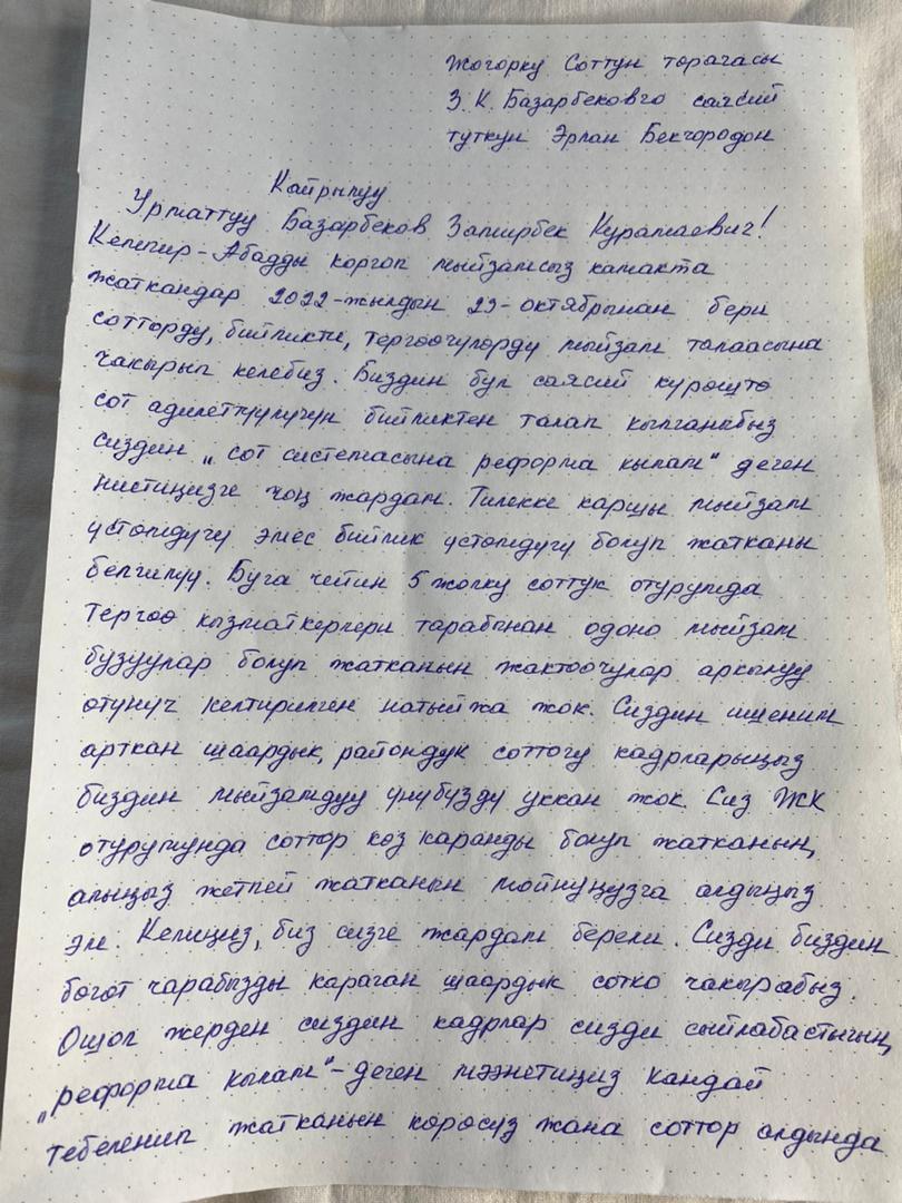 Урматтуу Базарбаев Замирбек Курамаевич! Кемпир-Абадды коргоп мыйзамсыз абакта жаткандар 2022-жылдын 23-октябрынан бери сотторду, бийликти, тергөөчүлөрдү мыйзам талаасына чакырып келебиз. Биздин бул саясий күрөштө сот адилеттүүлүгүн бийликтен талап кылганыбыз сиздин «сот системасына реформа кылым», - деген ниетиңизге чоң жардам.
