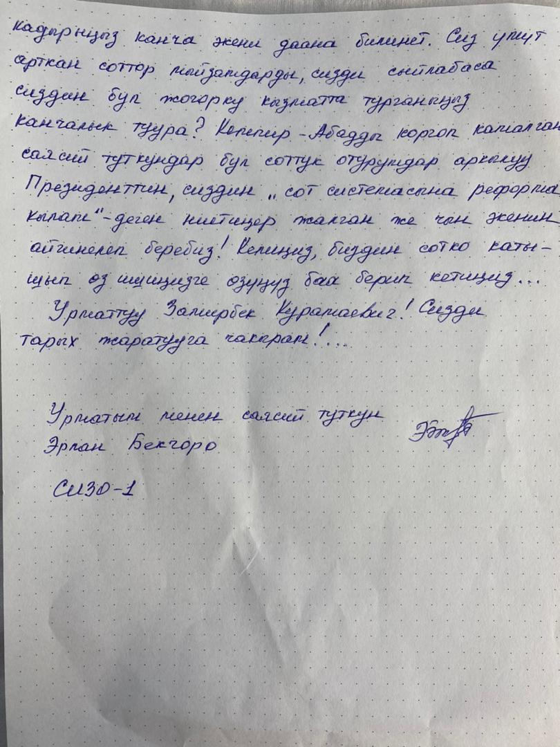 Жогорку соттун төрагасы З.К.Базарбековго саясий туткун Эрлан Бекчородон кайрылуу