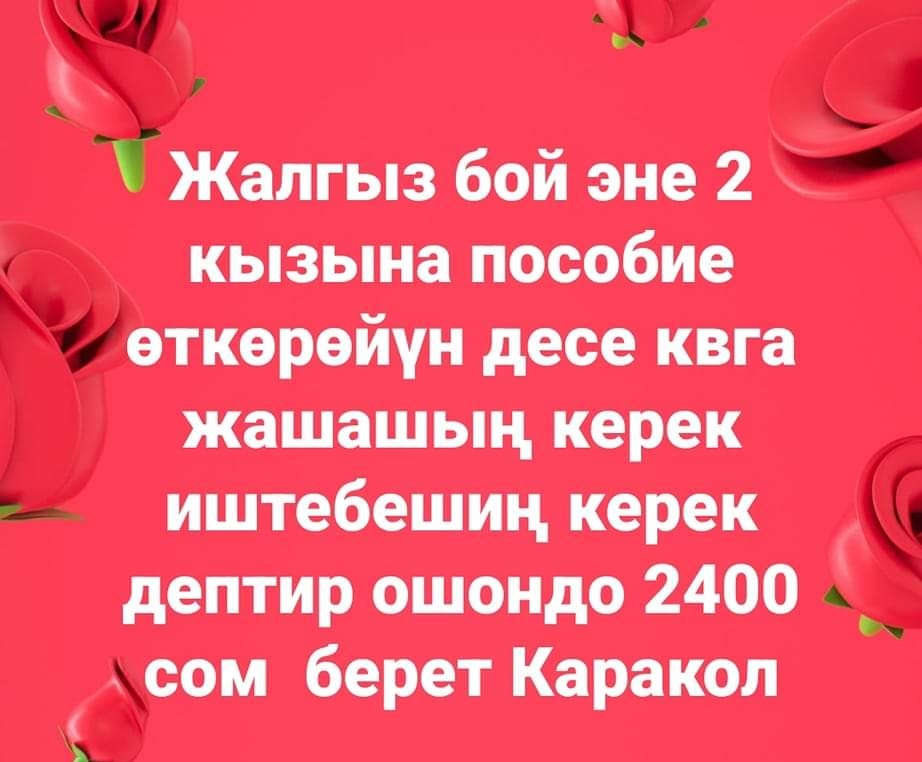 Каракол шаарында бир карапайым жалгыз бой эне, кызына 2400 сом пособие алайын десе, "пособие алыш үчүн батирде жашап, иштебешиң керек, сага берилбейт" деген жооп болуптур. Бул тууралуу Фейсбук тармагында жазылып, талкууланып жатат.