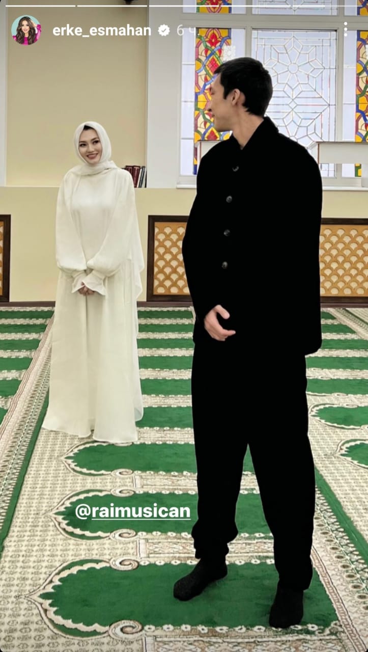 Белгилүү айтыш чебери Айнур Турсынбаева Instagram баракчасына эксклюзивдүү сүрөт жарыялады. Анда Ерке Есмахан менен Райымбек Бактыгереевдин мечитте турганы тартылган. Автор ырчылар жума күнү баш кошушканын жазган.