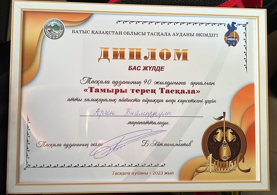 Батыш Казакстан облусунун Таскала районунун 90 жылдыгына арналган "Тамыры терең Таскала" аттуу Эл аралык айтышта Кыргыз улуттук "Манас" театрынын төкмө акыны Арген Биймырза уулу баш байгени багындырды.