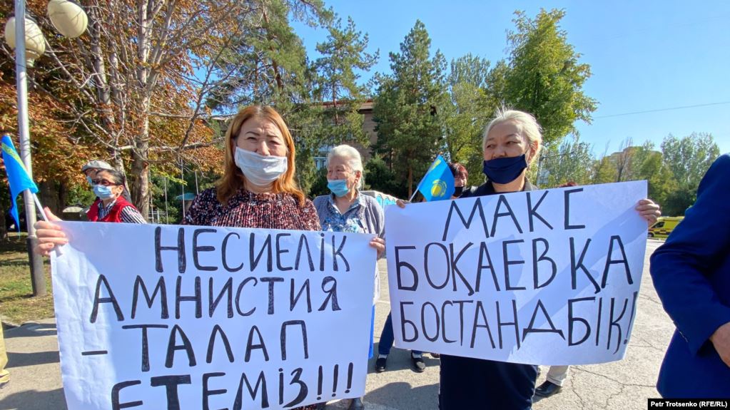 Буга чейин демилгелүү топтун башчысы, активист Жанболат Мамай тарапкерлерин чогулууга чакырган. Акцияга ондогон адамдар келди. Алар колдоруна жарандык активист Макс Бокаевди, Арон Атабекти бошотууну талап кылган баракчаларды көтөрүп турушат. Акцияга полиция кызматкерлери көз салышууда. Активист Мамайдын айтымында, ушундай эле акциялар Караганды, Актөбө жана Семей шаарларында өтүп жатат. Ал эми Чымкент жана Таразда жергиликтүү бийлик митингге уруксат берген эмес.
