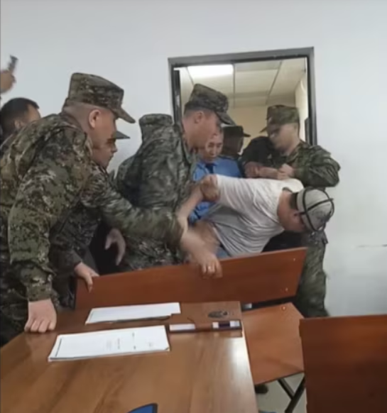 Аны конвойлор колунан кармап күч менен залдан чыгарып бараткан видеону адвокат Эркин Саданбеков жана ушул эле иш боюнча шек саналып жаткан Гүлнара Журабаева Фейсбуктагы баракчаларына жарыялады.