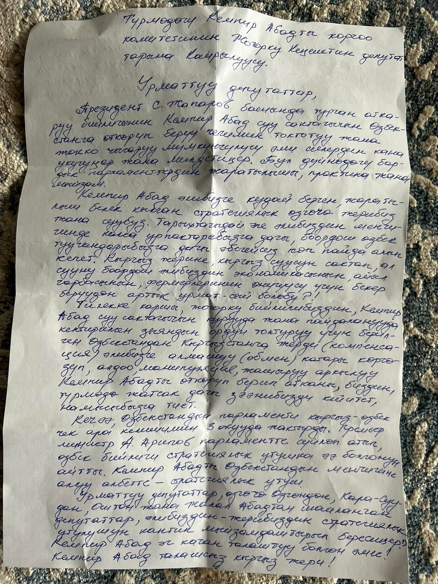 «Урматтуу депутаттар, Президент Садыр Жапаров башында турган аткаруу бийлигинин Кемпир-Абад суу сактагычын Өзбекстанга өткөрүп берүү чечимин токтотуу жана жокко чыгаруу мүмкүнчүлүгү эми силердин гана укугуңар жана милдетиңер. Бул дүйнөдөгү бардык парламенттердин жаратылышы, практика жана мыйзам. Кемпир-Абадды элибизге кудай берген, жаратылыш белек кылган стратегиялык өзгөчө жерибиз жана суубуз. Тарыхтагыдай эле элибиздин менчигинде кана урпактарыбызга дагы, боордош өзбек туугандарыбызга дагы эбегейсиз көп пайда алып келет. Кыргыз жерине, кыргыз суусун сактап, ал сууну боордош элибиздин экономикасынын, айыл чарбасынын, фермерлеринин өнүгүүсү үчүн бекер берүүдөн артык урмат-сый болобу? Кечээ, Өзбекстандын парламенти кыргыз-өзбек чек ара келишимин 3 окууда жактырды. Премьер-министр А. Арипов парламентте сүйлөп атып, өзбек бийлиги стратегиялык утушка ээ болгонун айтты. Кемпир-Абадды Өзбекстандын менчигине алуу албетте-стратегиялык утуш. Урматтуу депутаттар, өзгөчө Өзгөндөн, Кара-Суудан, Оштон жана Жалал-Абаддан шайланган депутаттар, элибиздин — жерибиздин стратегиялык утулушун кантип мыйзамдаштырып бересиңер? Кемпир-Абад эч качан талаштуу болгон эмес!»,-деп жазылат кайрылууда.
