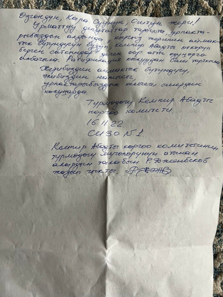 Кемпир-Абадды коргоо комитетинин мүчөлөрү абактан Жогорку Кеңештин депутаттарына кайрылуу жасашты. Алардын талабын саясатчы Равшан Жээнбеков кат аркылуу жазган.