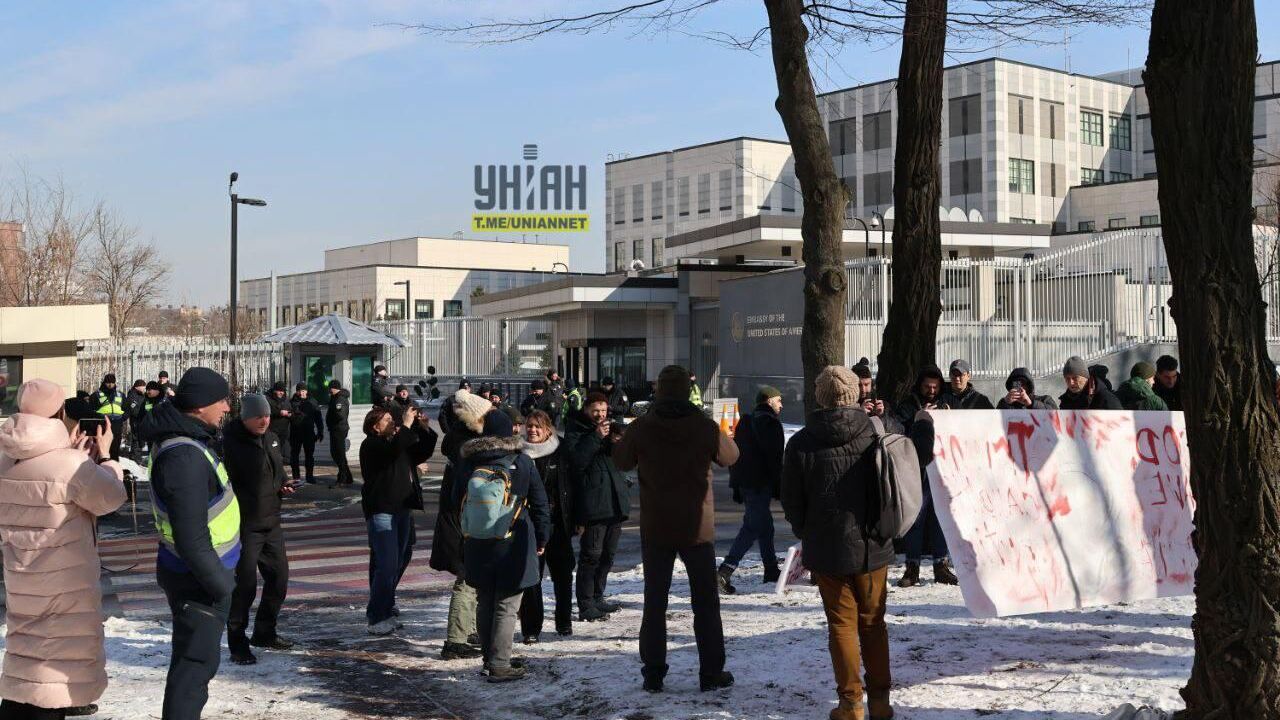 Агенттик жарыялаган видеодо акциянын бир катышуучусу АКШ президенти Дональд Трампка ишенүүгө болбойт деп айтып, анткени ал Украинадан "үч жолу баш тартканын" белгилеген. Элчилик имаратынын жанында полиция кызматкерлери күзөттө турушат.
