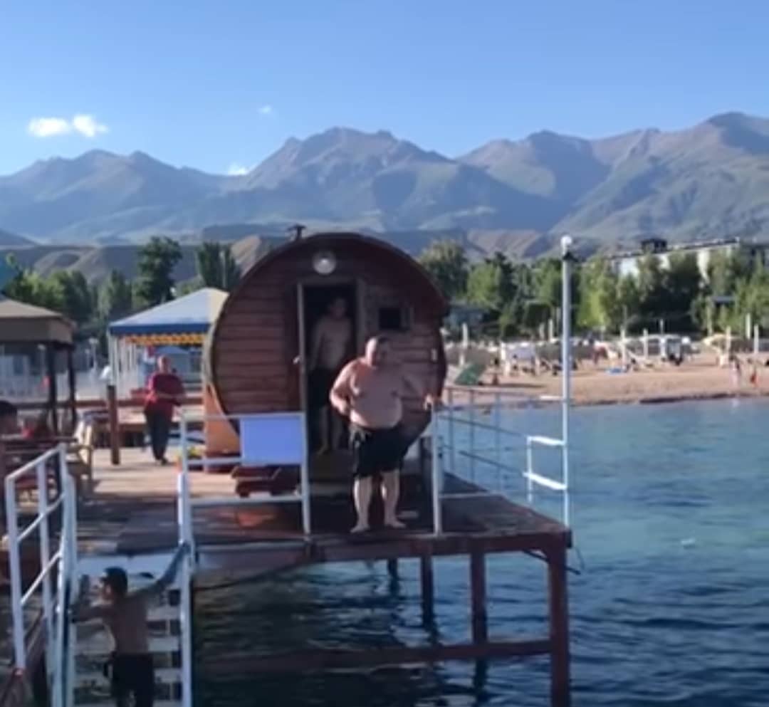 Социалдык тармактын колдонуучусу депутат «Costa Brava» пансионатында эс алуу учурунда пляждагы пирсте орун алган буу бөлмөдөн (парилка) чыгып, көлгө секиргени жаткан видеосун жарыялады.
