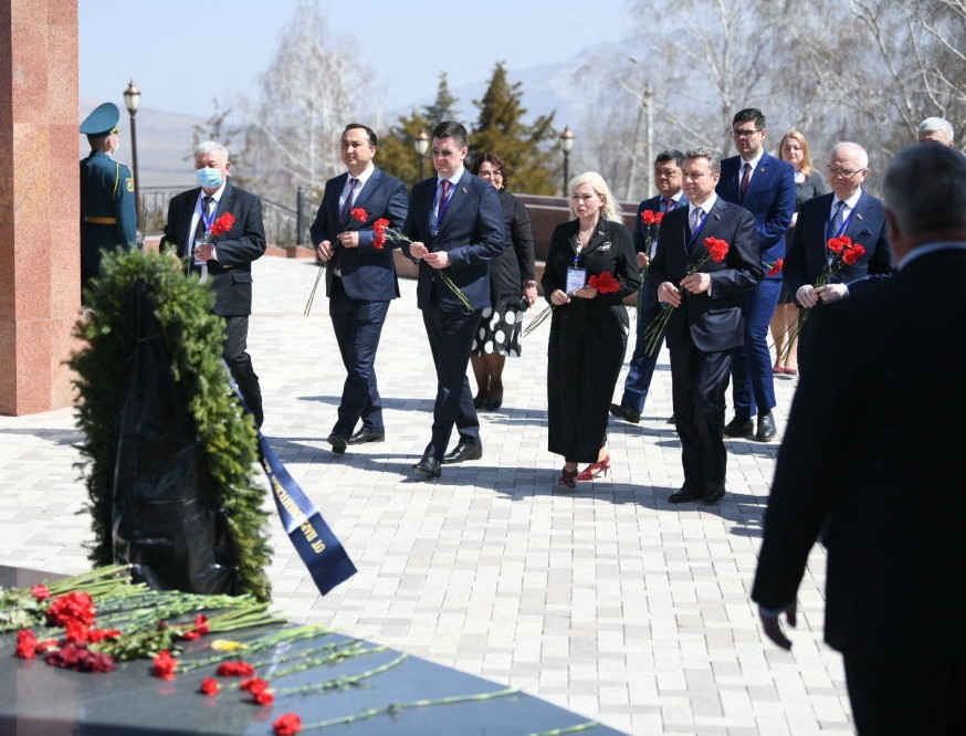 КМШнын Парламенттер аралык Ассамблеясынын байкоочулары "Ата-Бейит" комплексине барып 1916-жылдагы трагедиялуу окуянын курмандыктарынын элесине арналып тургузулган мемориалга гүл коюшту.