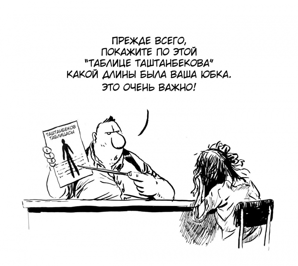 Сүрөтчү Нурбек Насыранбеков укук коргоо органынын кызматкери зордуктоодон жапа чеккен кыза көрсөтүп жаткан "Таштанбековдун таблицасы" аттуу карикатураны жарыялады. Бул таблица жабырлануучунун юбкасынын узундугун аныктайт.