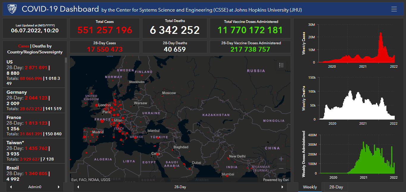 Жалпысынан пандемия башталгандан бери дүйнөдө 551 миллион 257 миң 196 адам коронавирус жуктурган. Баарынан да АКШ (88 миллион 66 миң 96), Индия (43 миллион 531 миң 650), Бразилия (32 миллион 610 миң 514), Франция (31 миллион 861 миң 391), Улуу Британия (22 миллион 942 миң 394) , Россия (18 миллион 176 миң 132), Түркия (15 миллион 180 миң 444), Аргентина (9 миллион 394 миң 326), Иран (7 миллион 241 миң 648), Колумбия (6 миллион 175 миң 181), Испания (12 миллион 890 миң 2 ), Италия (18 миллион 938 миң 771) жана Германия (28 миллион 673 миң 212) өлкөлөрүндө эң көп катталган.