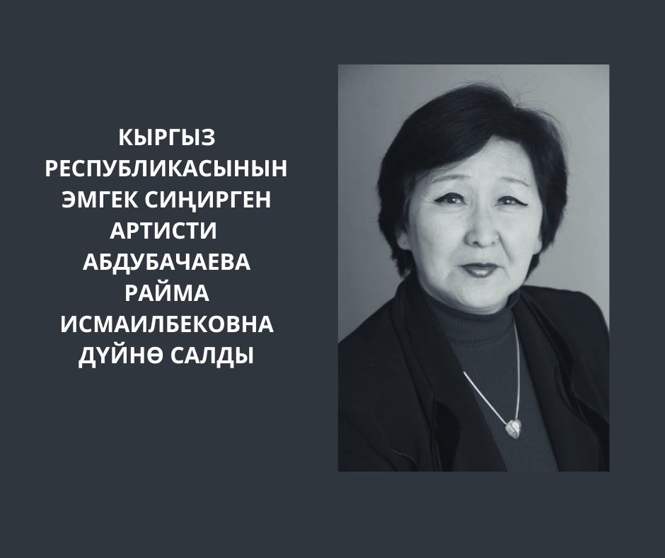 Кыргыз Республикасынын эмгек сиңирген артисти Абдубачаева Райма Исмаилбековна 75 жашында дүйнөдөн өттү. Бул тууралуу Маданият, маалымат, спорт жана жаштар саясаты министрлиги кабарлады.