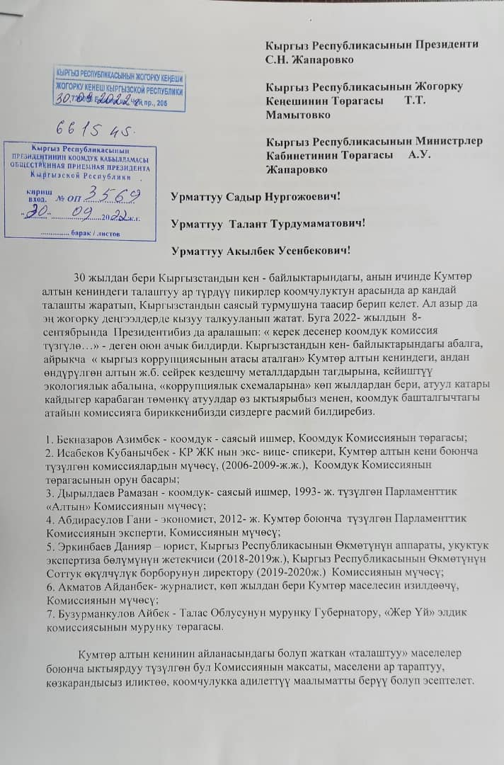 Кыргызстандын кен байлыктарындагы абалга, айрыкча «кыргыз коррупциясынын атасы аталган» Кумтөр алтын кениндеги, андан өндүрүлгѳн алтын ж.б. сейрек кездешүүчү металлдардын тагдырына, кейиштүү экологиялык абалына, «коррупциялык схемаларына» көп жылдардан бери, атуул катары кайдыгер карабаган төмөнкү атуулдар өз ыктыярыбыз менен, коомдук башталгычтагы атайын комиссияга бириккенибизди сиздерге расмий билдиребиз.