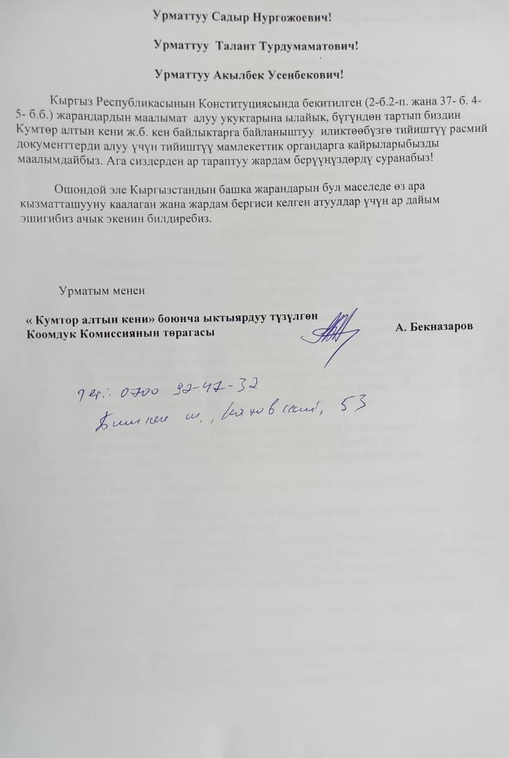 Кыргыз Республикасынын Конституциясында бекитилген (2-б.2-п. жана 37- б. 4- 5- б.б.) жарандардын маалымат алуу укуктарына ылайык, бүгүндөн тартып биздин Кумтөр алтын кени ж.б. кен байлыктарга байланыштуу иликтѳѳбүзгѳ тийиштүү расмий документтерди алуу үчүн тийиштүү мамлекеттик органдарга кайрыларыбызды маалымдайбыз. Ага сиздерден ар тараптуу жардам берүүңүздөрдү суранабыз!