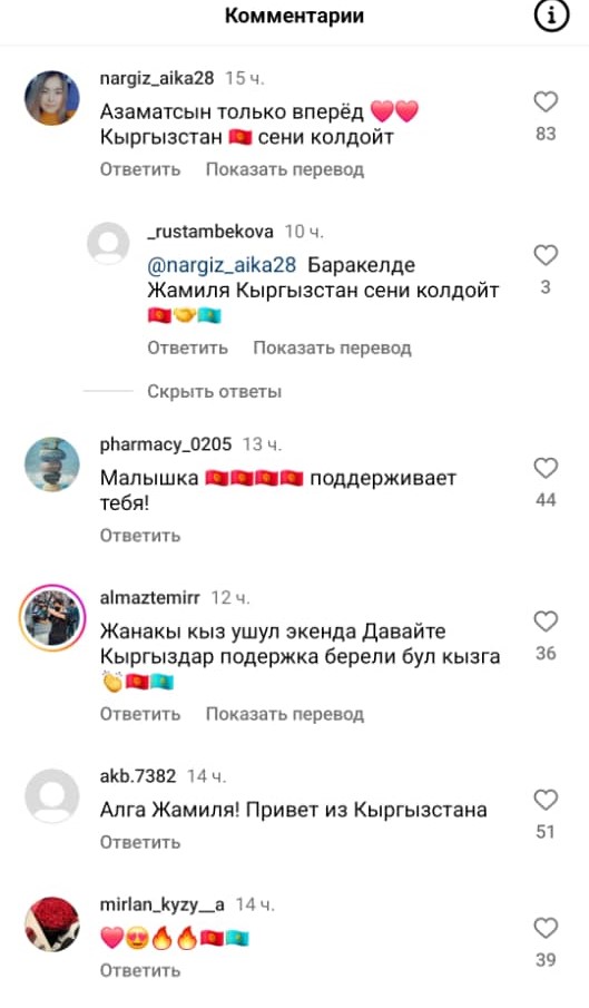 Казак балбаны Жамиля Бакбергенованын Кыргызстандагы күйөрмандарынын саны көбөйдү. Анын инстаграмдагы баракчасына кыргыздар мындан ары ага дагы колдоо көрсөтөрүн жазышууда.