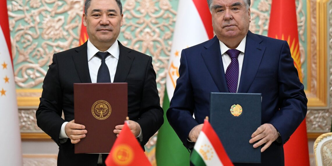 Президент Садыр Жапаров менен Тажикстандын президенти Эмомали Рахмон бүгүн, 31-мартта, Худжанд шаарында Ратификациялык грамоталар менен алмашуу жөнүндө протоколго кол коюу аземине катышты.