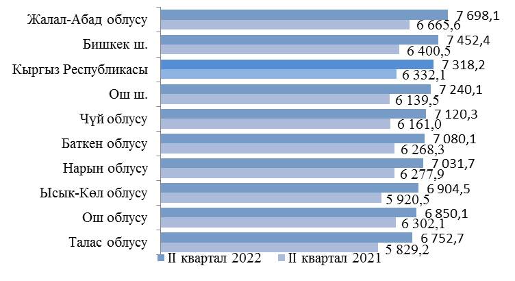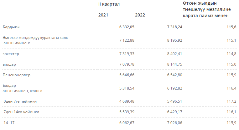 2022-жылдын II кварталында орточо калктын киши башына жашоо минимумунун көлөмү жалпы республика боюнча 7 318,24 сомду түздү жана өткөн жылдын тиешелүү мезгилине салыштырганда 15,6 пайызга өстү. Бул тууралуу Улуттук статистика комитети билдирет.