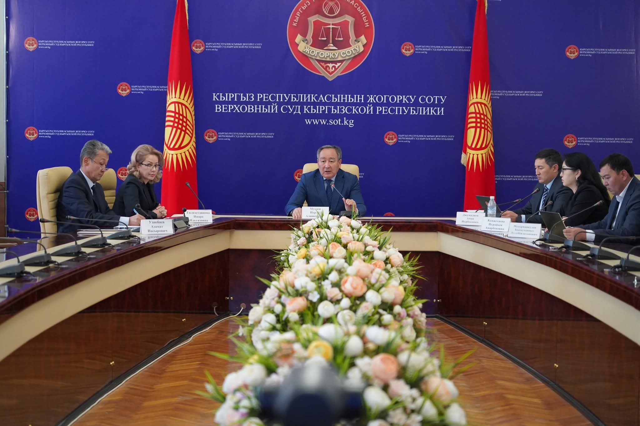 Кыргыз Республикасынын Жогорку сотунун Төрагасынын орун басары Нурлан Мусаев бүгүн жергиликтүү соттордун төрагалары менен онлайн-кеңешме өткөрдү. Кеңешменин ишине Жогорку соттун судьясы, сот тутумун санариптик өнүктүрүү боюнча жумушчу топтун жетекчиси Инара Гилязетдинова, жумушчу топтун мүчөлөрү, жергиликтүү соттордун судьялары: Азамат Узакбаев, Нурайым Кенжетаева, Бекмухаммет Мусурманкулов, ошондой эле Жогорку соттун Аппарат Жетекчисинин орун басары Аман Джумалиев катышты.