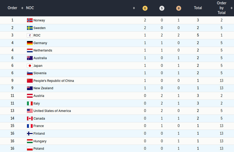 Кышкы Олимпиада оюндарындагы азыркы жыйынтык боюнча алдыда Норвегиянын спортчулары келе жатат. 2 күндө 12 топтом медаль ойнотулган. Анын ичинен 2 алтын жана 1 күмүш медаль норвегиялыктардын куржунунда.