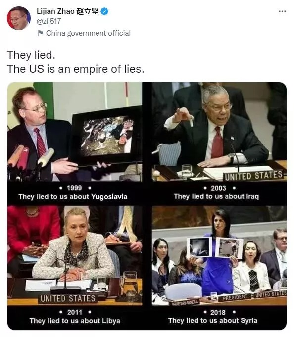 Кытайдын Тышкы иштер министрлигинин өкүлү Чжао Лицзян Твиттер баракчасына АКШны дайыма жалган айтат деп айыптады.
