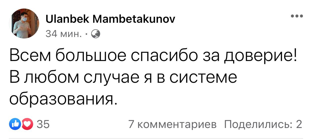 «Мага ишенгениңиздерге ыраазычылык! Кандай болбосун мен билим берүү системасында калам», — деп жазды ал.