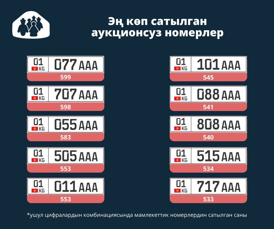 Аталган мекеменин басма сөз кызматы бүгүн, 18-ноябрда билдиргендей, эң көп сатылган ТОП-10 аукционсуз номурлар төмөнкүлөр: