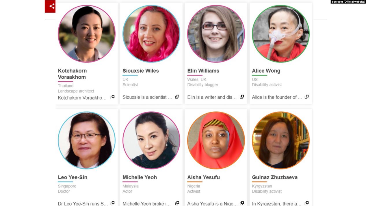 BBC дүйнөлүк кызматы 2020-жылдагы таасирдүү жана үмүт жараткан 100 айымдын тизмесин жарыялады. Бул тизмеге кыргызстандык Көзү азиздер федерациясынын башчысы, активист Гүлназ Жүзбаева да кирди. Ал өкмөттүк документтердин Брайл шрифтине өткөрүүгө тынымсыз аракет кылып, көзү азиздердин социалдык адаптациясы боюнча программаны ишке ашырганы үчүн тизмеге кошулган.