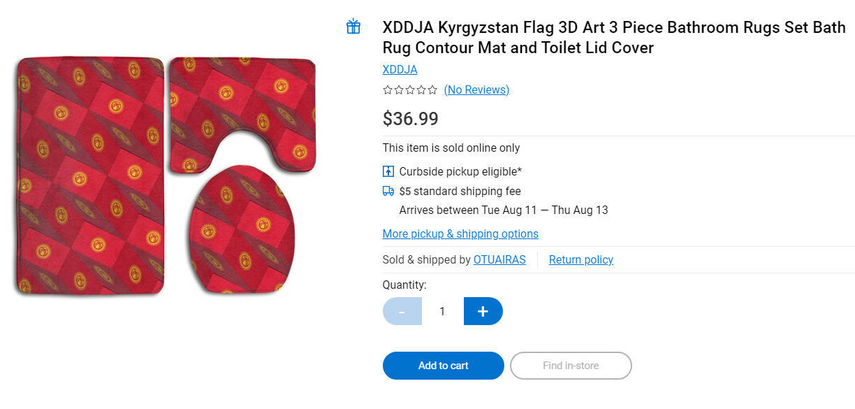 Бир катар электрондук коммерциялык аянтчаларда Кыргызстандын мамлекеттик желеги тартылган килемче, ванна жана ажаткана каражаты сатыкка чыгарылды
