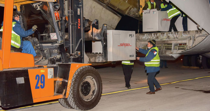 Препаратты Орусиянын Өзгөчө кырдаалдар министрлигинин учагы жеткирип келген. Жүктү "Манас" аэропортунан саламаттык сактоо министринин орун басары Улук-бек Бектурганов тосуп алган.