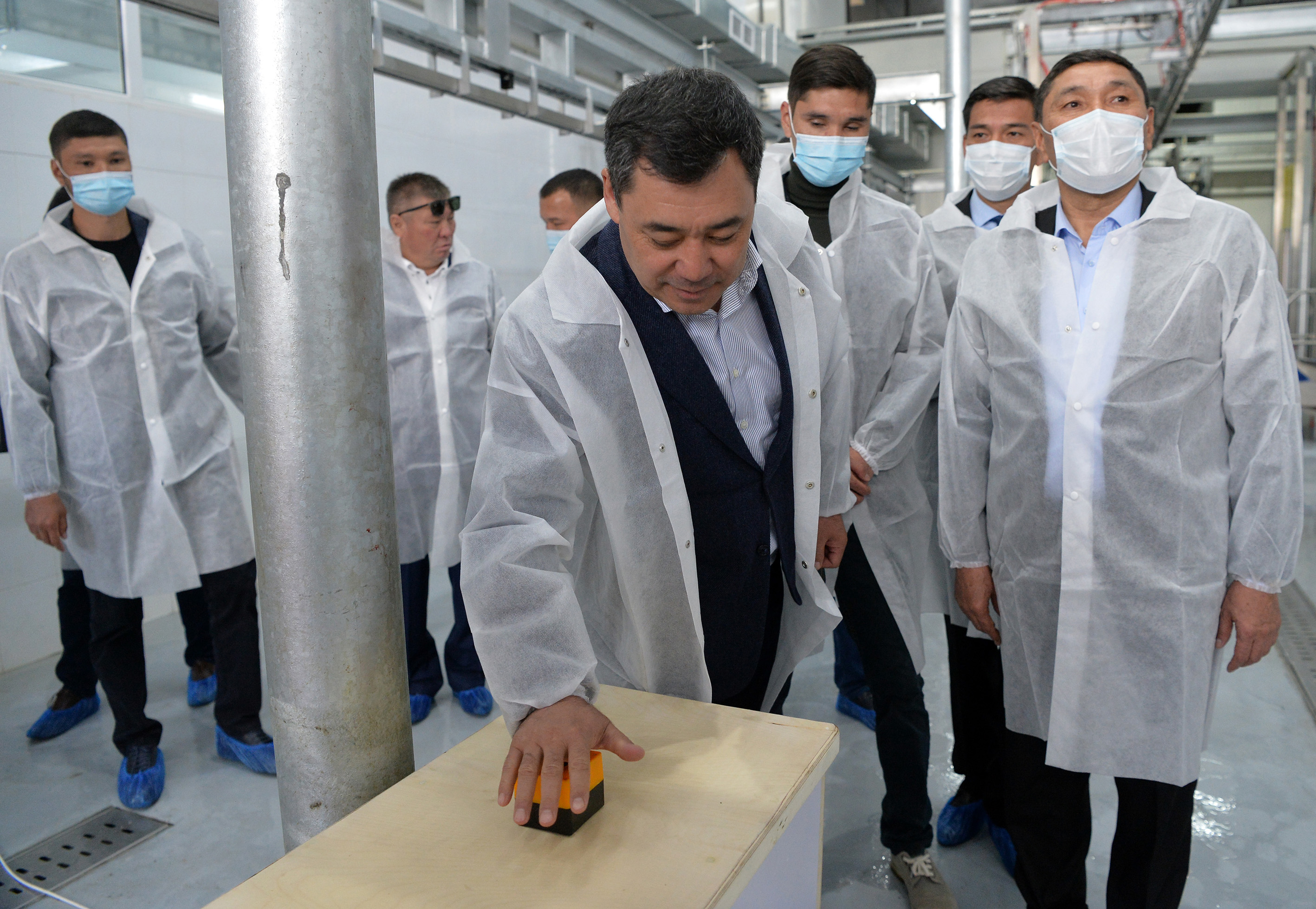 Садыр Жапаров эт комбинатынын өндүрүш цехтерин, иш бөлмөлөрүн көрүп чыкты. Президент ишкананын учурда региондун, келечекте бүтүндөй өлкөнүн, азык-түлүк коопсуздугун камсыз кылууга салымын кошуп жатканын канааттануу менен белгиледи.