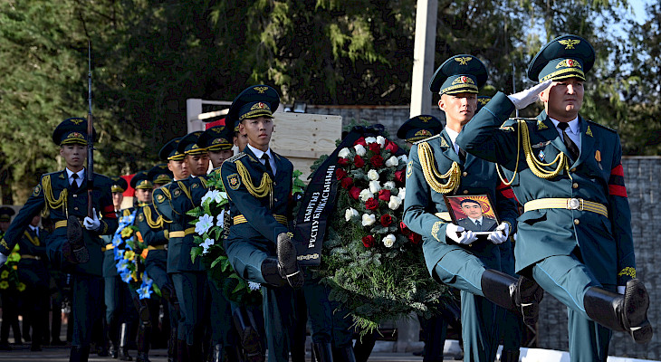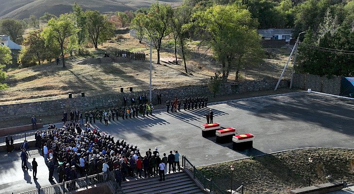 Президент Садыр Жапаровдун катышуусунда бүгүн, 26-сентябрда, “Ата-Бейит” Улуттук тарыхый-мемориалдык комплексинде 2022-жылдын 14-17-сентябрында кыргыз-тажик мамлекеттик чек арасындагы окуялардын жүрүшүндө курман болгон УКМКнын Чек ара кызматынын аскер кызматкерлери – танк экпиажынын мүчөлөрү Шерали Анаркуловдун, Санжарбек Анаркуловдун жана Жаңыбай уулу Тилектин сөөгү жерге берилди.