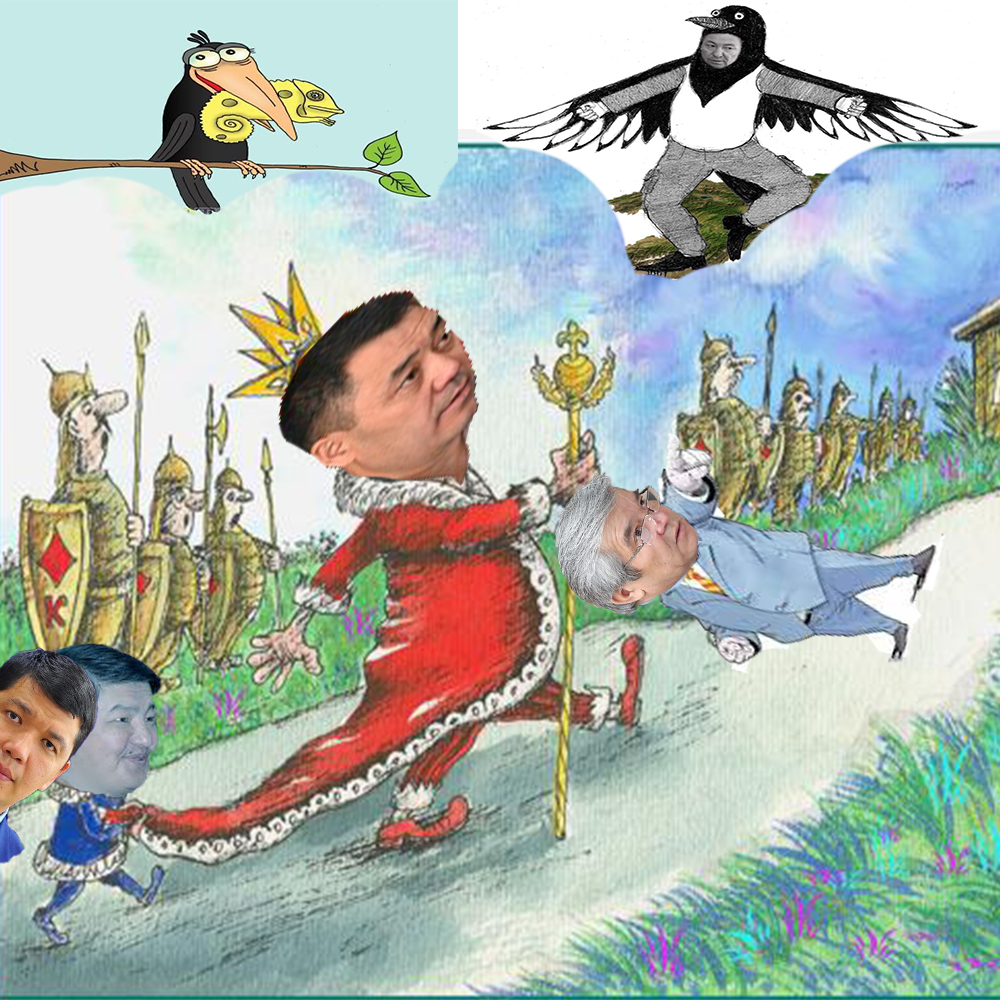 Президент Садыр Жапаров «свиталары»: президенттик аппарат жетекчиси Касмамбетов, кеңешчиси Акылбек Жапаров, өкмөт аппаратын жетектеген Жунушалиевдер менен «Эркиндик» сейил багында сейилдеп жүрсө, капыстан учуп жүргөн каргалардын бири пок таштап жиберип, так төбөсүнө келип кадалат. Анда Касмамбетов: «Улуу урматтуу Садыр Нургожоевич, бул биздин каргалар эмес, Мадумаровдун оппозиционер каргалары экен, атайын сизди каралап жатат. Биздин каргалар болсо Акылбек Жапаровго окшоп чачпагыңызды көтөрүп жүрмөк».- дейт имиш.